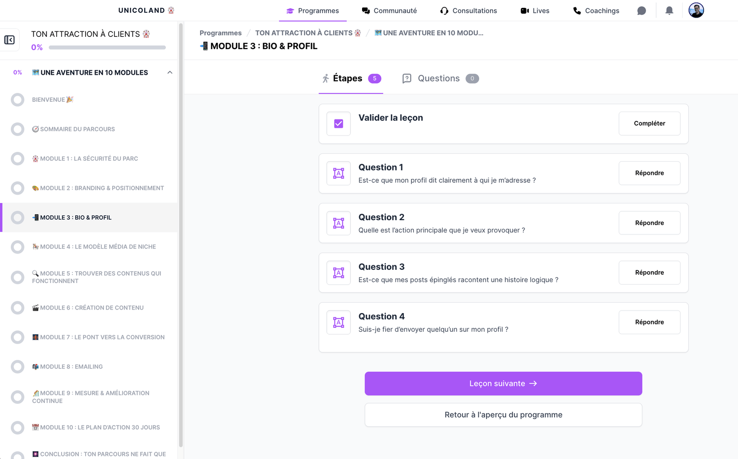 Tu avances module par module, sans te perdre.