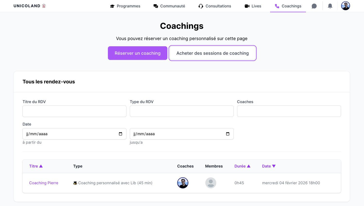 Chaque session est payante, sans engagement, et se réserve directement depuis ton tableau de bord.